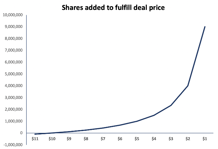 Kestrel was acquired with $16m in cash and $15m in stock. $10m of the stock portion, priced at approximately $10.12 post-split, will be held in escrow and repriced to the 30-day volume weighted average one year from the closing date. Thus, as the stock moves lower an increasing number of shares are required to fulfill the deal price. The 30% move lower in Zynex shares since the announcement has already added 360k shares. If Zynex is as impaired as we believe, the Kestrel equity financing exacerbates downside.